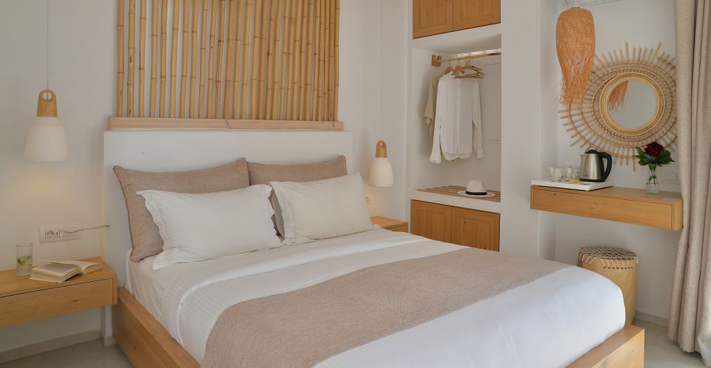 Featuring a comfortable queen size bed with Coco-Mat mattress, an open space bathroom with shower, an open closet, a working desk and a balcony with a view to our swimming pool and side sea view.