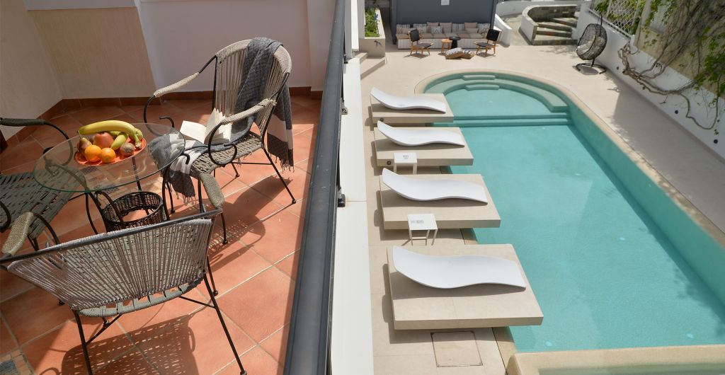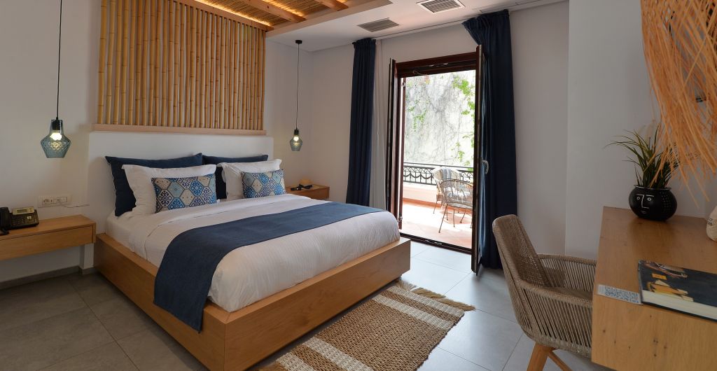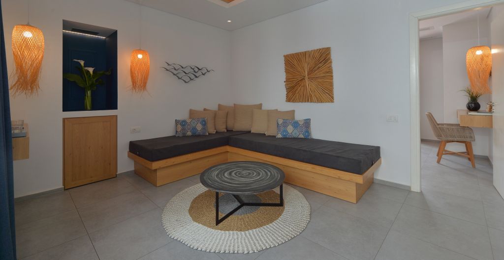 Each Superior Family room has been blessed with inimitable elegance while optimal comfort is provided with every detail. Ideal for families or a group of friends, these rooms offer a bedroom with a comfortable queen size bed with Coco-Mat mattress, a separate living room area with one or two sofa beds, a bathroom with shower, an open closet, a working desk and a balcony with a view to our swimming pool and side sea view.